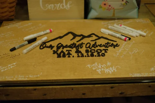 Beth and Scott wanted to fill their wedding with touches of their love of outdoors and hiking. We brought in lots of fern leaves, river rock place cards, and a trail themed seating chart among other things. Photography by Keefer photo!